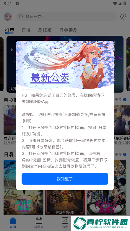 3、打开新APP(1.0.9)中我的页面,点击右上角的设置图标,找到账号恢复,将第二步获取到的文本内容粘贴进去就可以恢复账号了