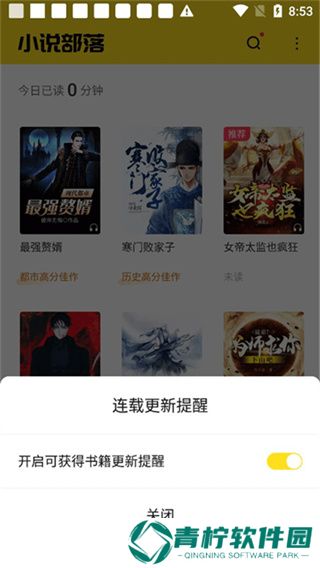 5、单击“书架”,然后点开三个小点还可以打开更新提醒,避免错过喜欢小说的更新内容。