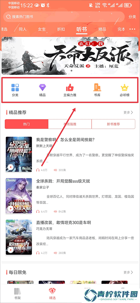 飞卢听书app如何听书1、在app精选界面中选择听书栏目,然后你可以根据分类、精品、主编力推、书库、必听榜来选择自己喜欢的书籍;