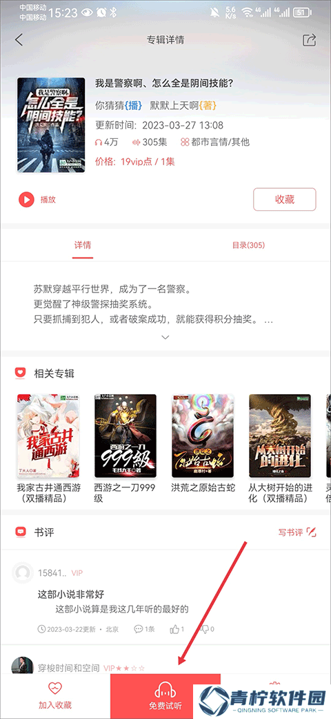 2、进入书籍详情界面后点击免费试听即可进入播放界面进行听书;