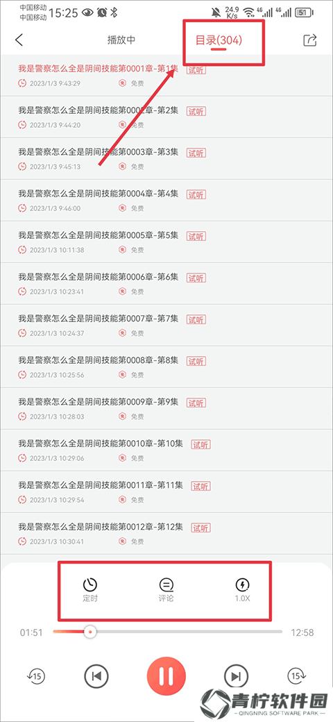 3、在播放界面中,你还可以进行定时、调整速度。也可以在目录中随意切换你想听的章节。