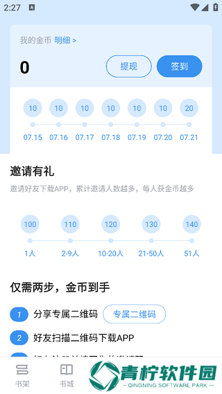 5、切换到下方中的“福利”板块,能够进行每日签到,签到即可获得相应的金币,还可以邀请好友下载软件;