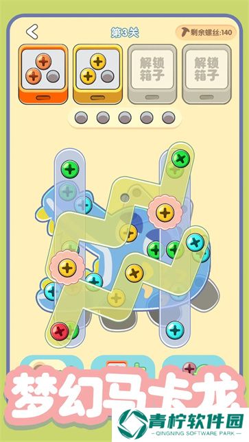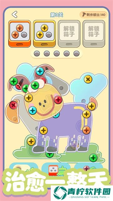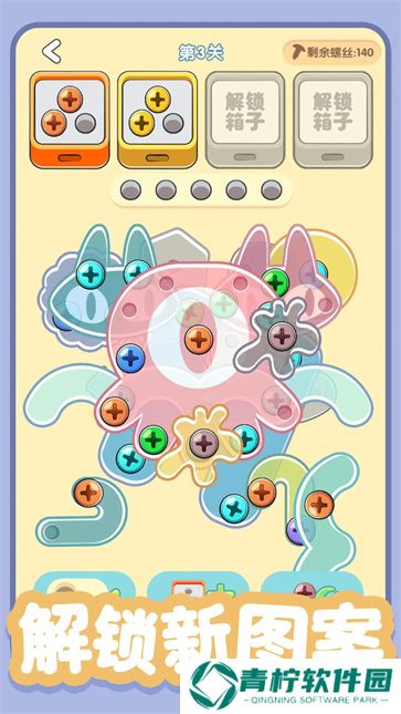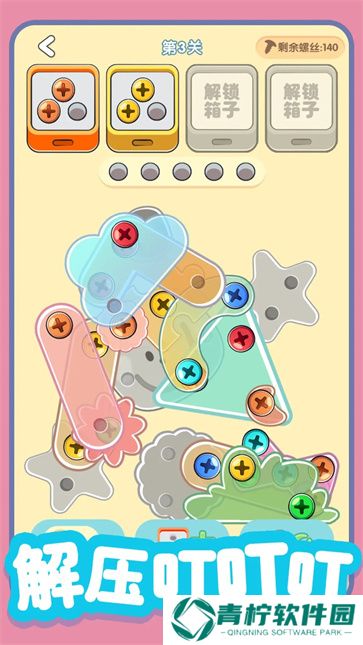 3、画面清新可爱,搭配流畅的交互体验,每次成功拧掉螺丝都能带来极大的满足感,是一款非常适合打发时间的休闲小游戏。